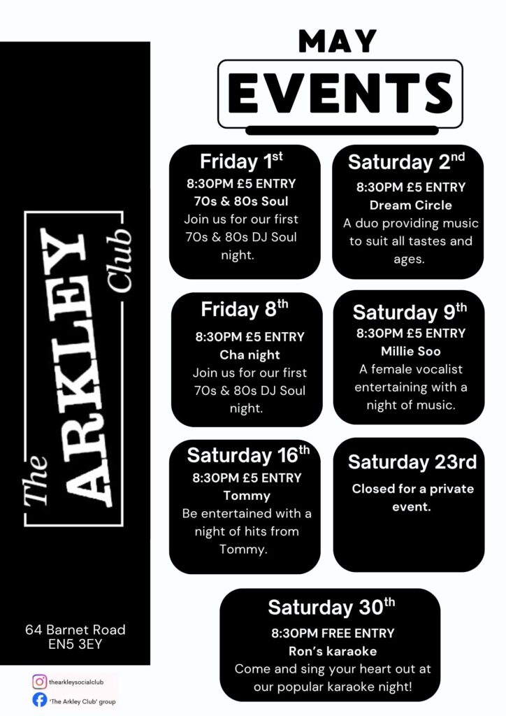 Tel: 020 8449 5726 Email: thearkleyclub@btconnect.com