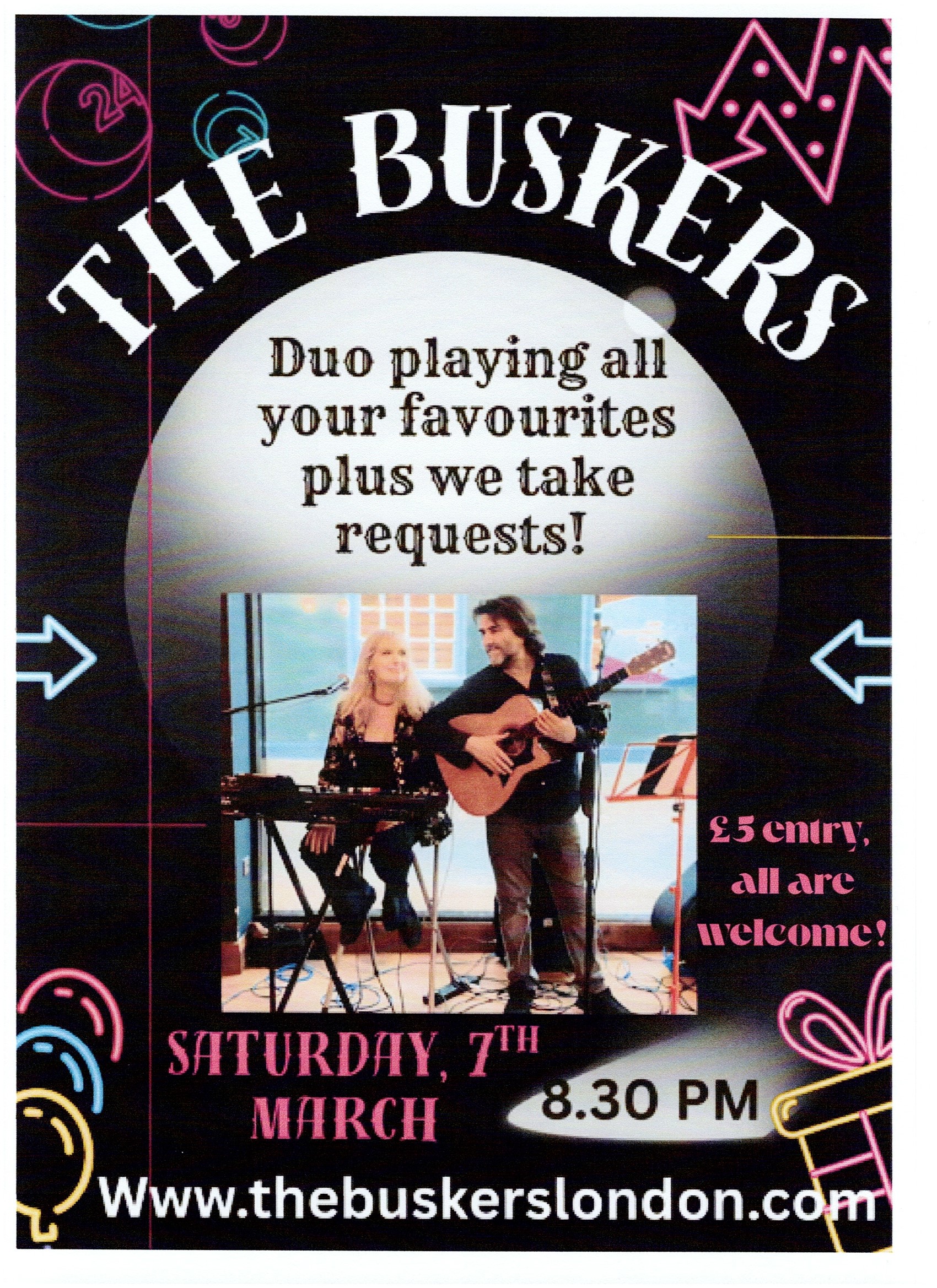 Saturday 7th March we have musical duo the Buskers playing all your favourites as well as taking requests.